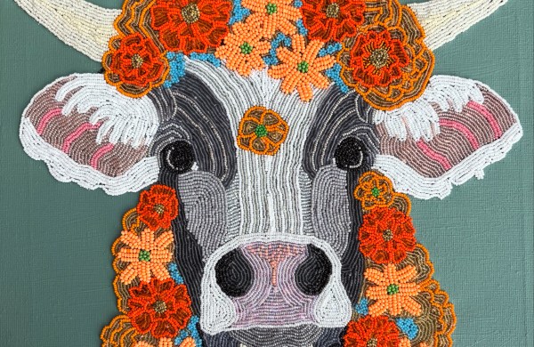 A large-scale art work utilizing beadwork, copper, painting, and epoxy resin on a wood panel. The work features beaded birds, a tree formed from antique copper embroidery plates, and a… Read more Neither Sow nor Reap, 2023 →
